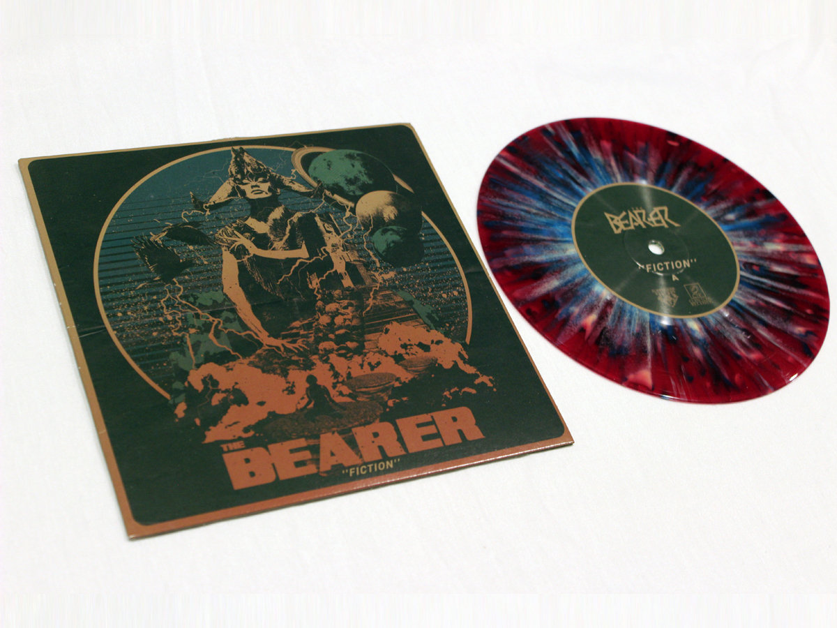 Pressed on transparent purple with blue and yellow splatter 7" vinyl.